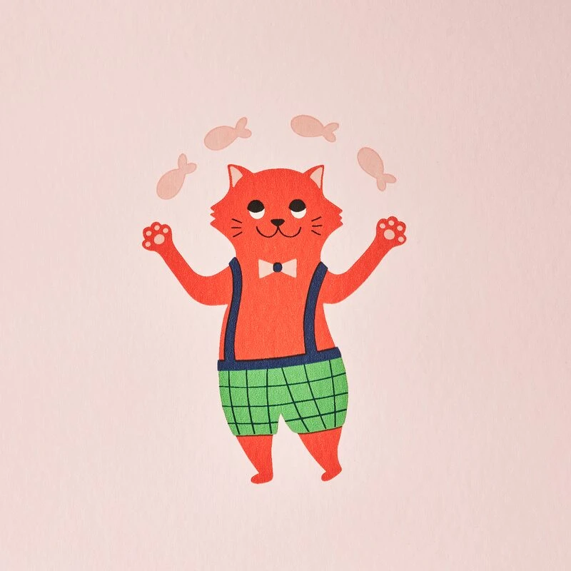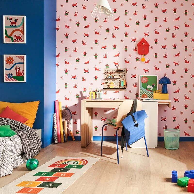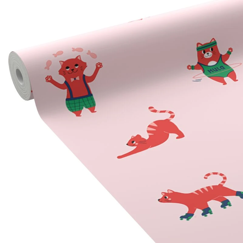 En effet, ce papier peint rose poudré a de quoi capter l’attention. Il représente plusieurs chats rigolos dans des contextes inhabituels. Par exemple, l’un d’eux porte une salopette verte à carreaux, se tient sur deux pattes et jongle avec des poissons. Il est d’ailleurs surprenant que ceux-ci soient toujours dans les airs et non dans la gueule du matou !