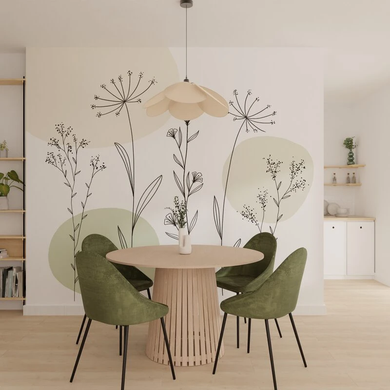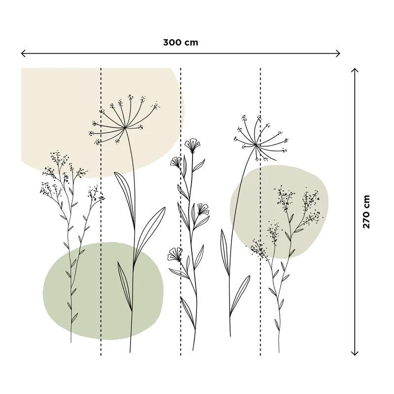 Dessinés par nos graphistes sur un fond clair, de fins motifs végétaux rencontrent de charmants cercles irréguliers dans les tons de vert et de beige. La délicatesse des dessins et des formes géométriques apporte de l’élégance à votre pièce et surtout, beaucoup de douceur.