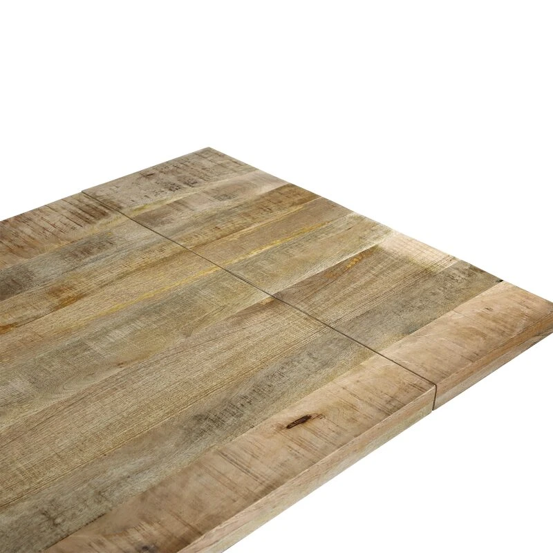 Cette table est composée d’un plateau de 3 centimètres d’épaisseur surmonté d’un second plateau, de 3 centimètres également, mais fabriqué en bois de manguier massif vernis, ce qui lui confère une qualité et un esthétisme d’exception. Cet assemblage est maintenu par un piétement en acier laqué noir, ce qui ajoute une touche moderne à ce meuble.