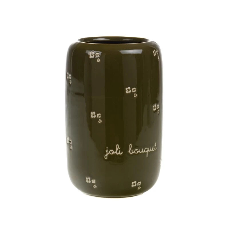 Ce vase d’une hauteur de 24 centimètres et d’un diamètre de 15 centimètres arbore une couleur kaki et porte l’inscription « joli bouquet ». Il est également orné de motifs floraux qui s’inscrivent sur lui dans un tracé plus clair.