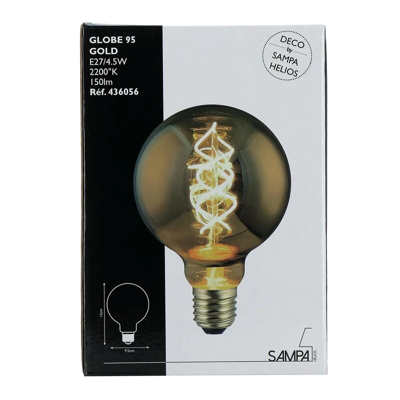 Cette ampoule à LED GLOBE G95 ne vous laissera pas indifférent avec son grand gabarit et sa magnifique silhouette. Son design original en forme de globe apporte une touche décorative supplémentaire à votre suspension ou lampe à poser. Par ailleurs son coloris or diffuse une lumière jaune et chaude, idéale pour réchauffer votre espace.