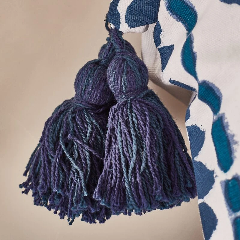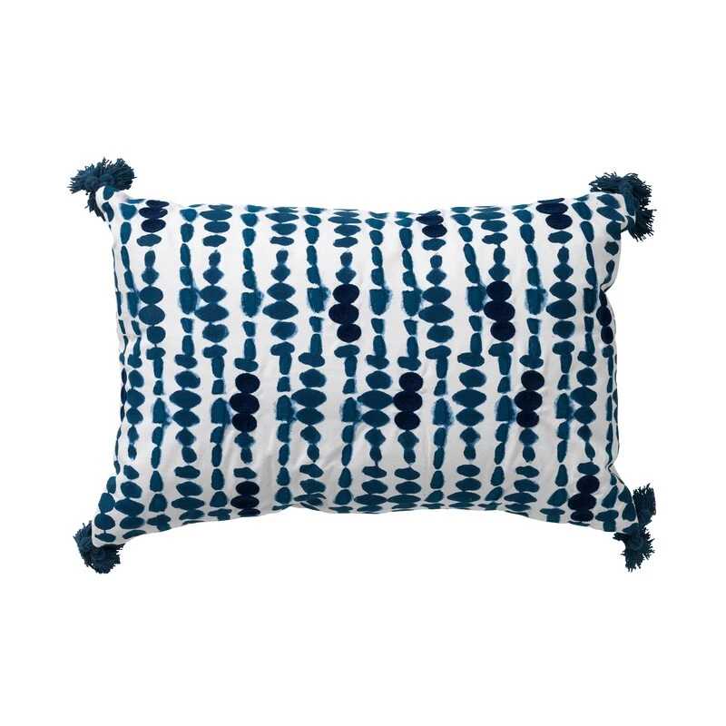 Donnez des airs de vacances à votre intérieur avec le coussin GABANNA. Son fond blanc, ses motifs bleus en tie and die et ses pompons aux quatre coins donnent tout son charme à ce coussin.