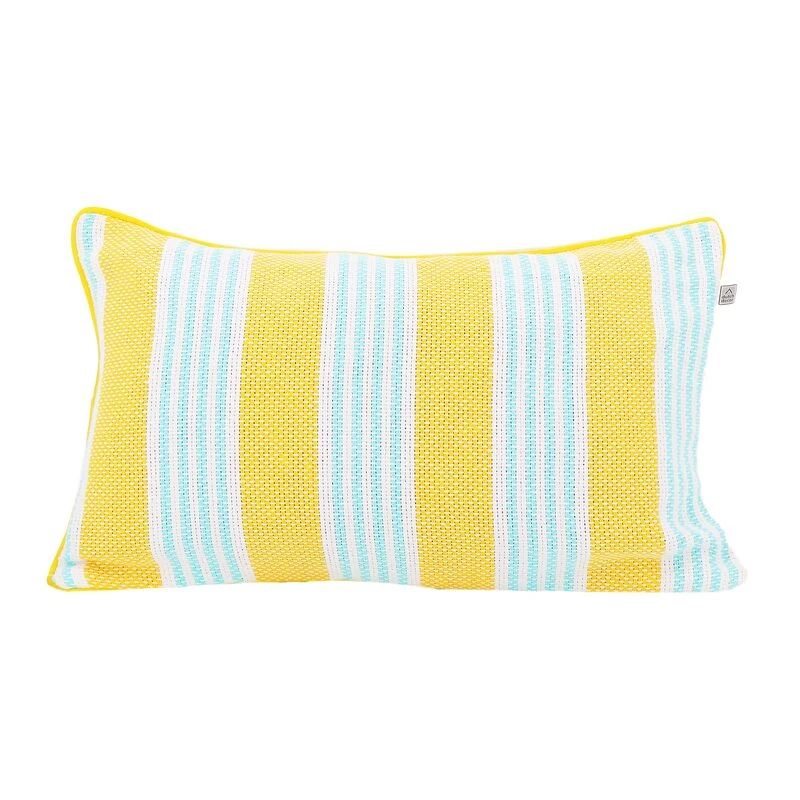 Du soleil et du ciel bleu même, puisque qu’il arbore des rayures jaune vif et des rayures bleu clair sur un fond blanc. Les rayures jaunes sont larges et les bleues plus étroites mais présentes par groupes de quatre. La housse de ce coussin est composée à 100 % de coton, et son rembourrage est en polyester.