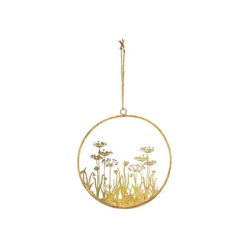 Cet élément décoratif se compose d’un anneau en métal dans lequel se dressent de nombreuses fleurs des champs, en métal elles aussi. À cette structure est nouée une petite corde qui vous permettra d’accrocher cette suspension florale où bon vous semble.