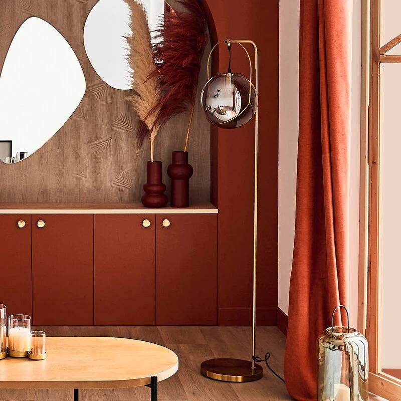 Son socle en métal doré peu encombrant permet de lui trouver une place facilement. Dans un salon, placé derrière le fauteuil, la bulle de verre du lampadaire apportera un éclairage doux idéal pour vos moments de lecture. Dans l’angle de la pièce, il mettra en valeur les volumes. Objet déco ou apport de lumière indispensable, le lampadaire est également bienvenu dans une chambre à coucher, un bureau ou une entrée.