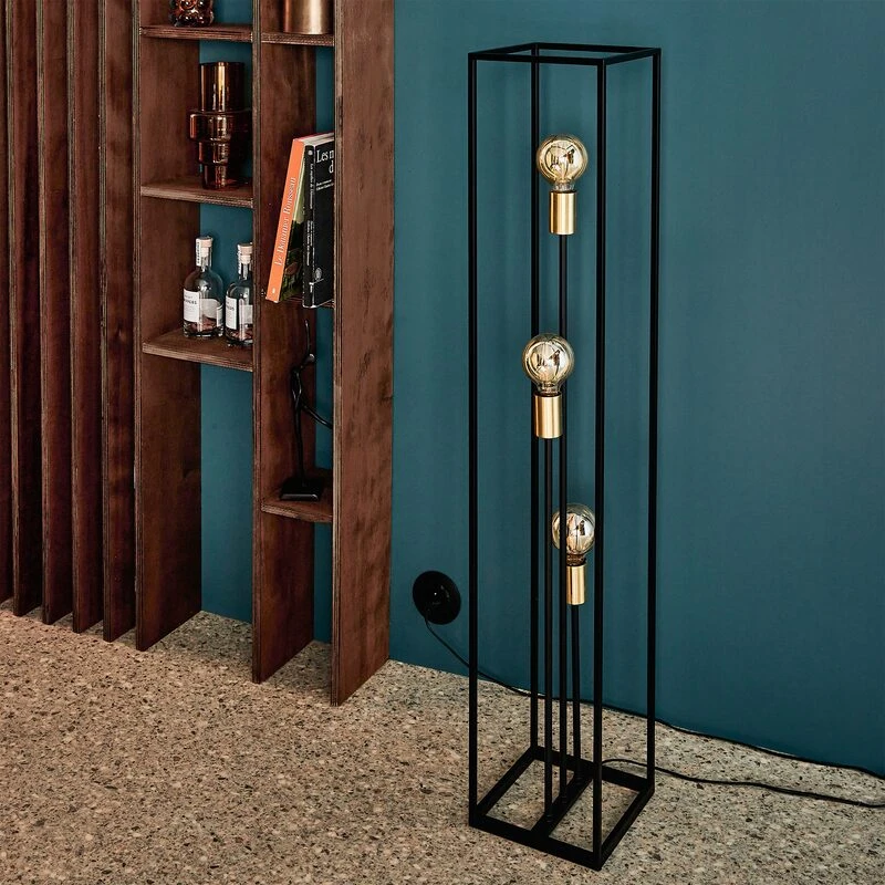 Conçu comme une cage métallique, RUBEN renferme trois ampoules montées sur des tiges de hauteurs différentes. C’est cette conception unique qui donne tout son atypisme et son charme à ce lampadaire. Le métal noir sera parfait dans un intérieur contemporain ou industriel. Une touche de cuivre sur les douilles apporte un léger aspect rétro.