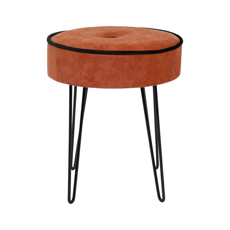 Les pieds métalliques en épingles de ce tabouret lui confèrent son aspect tendance et élégant. C’est également grâce à cette forme de pied que le tabouret COSTA possède une bonne stabilité. Le velours doux de l’assise est quant à lui particulièrement agréable. La couleur rouge cuivrée se trouve délicatement rehaussée par un liseré noir tout autour de l’assise et un bouton central, noir également.
