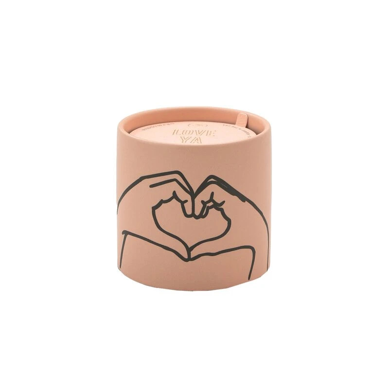Cette bougie est coulée dans un charmant pot en céramique rose qui représente deux mains dessinées en noir se rejoignant afin de former un cœur. Elle est accompagnée d’un cache-poussière arborant une feuille dorée.