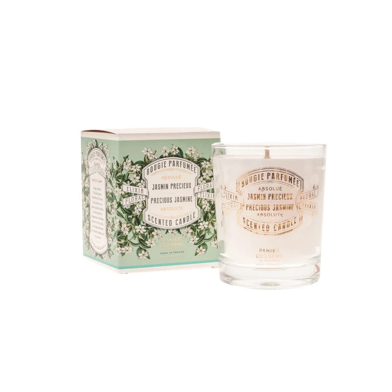 Succombez à cette ravissante et odorante bougie parfumée JASMIN PRÉCIEUX proposée par la marque française Panier des Sens. Un pur trésor olfactif conditionné dans un joli pot en verre subtilement décoré.