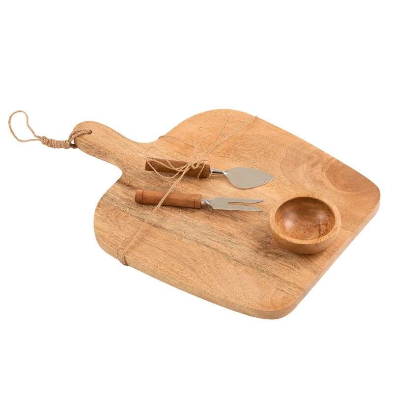 Quel est le point commun entre cette planche à découper le fromage, son couteau de service, sa fourchette à fromage et son bol ? Ils sont conçus en bois de manguier. Ce bois exotique donne un style indéniable à la planche à fromage et à ses accessoires.