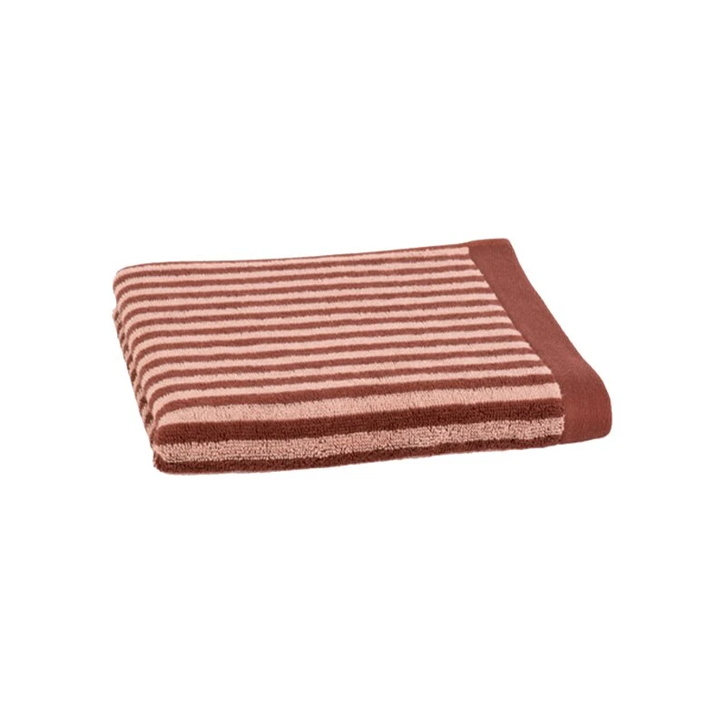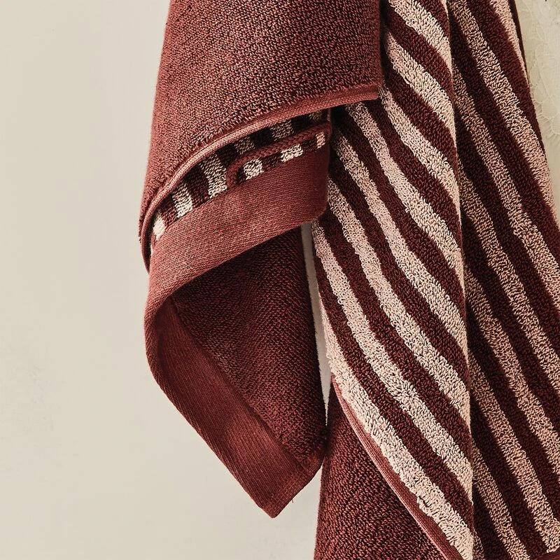 La serviette éponge RAFAELA arbore une jolie couleur bordeaux unie d’un côté et des rayures blanches et bordeaux de l’autre.