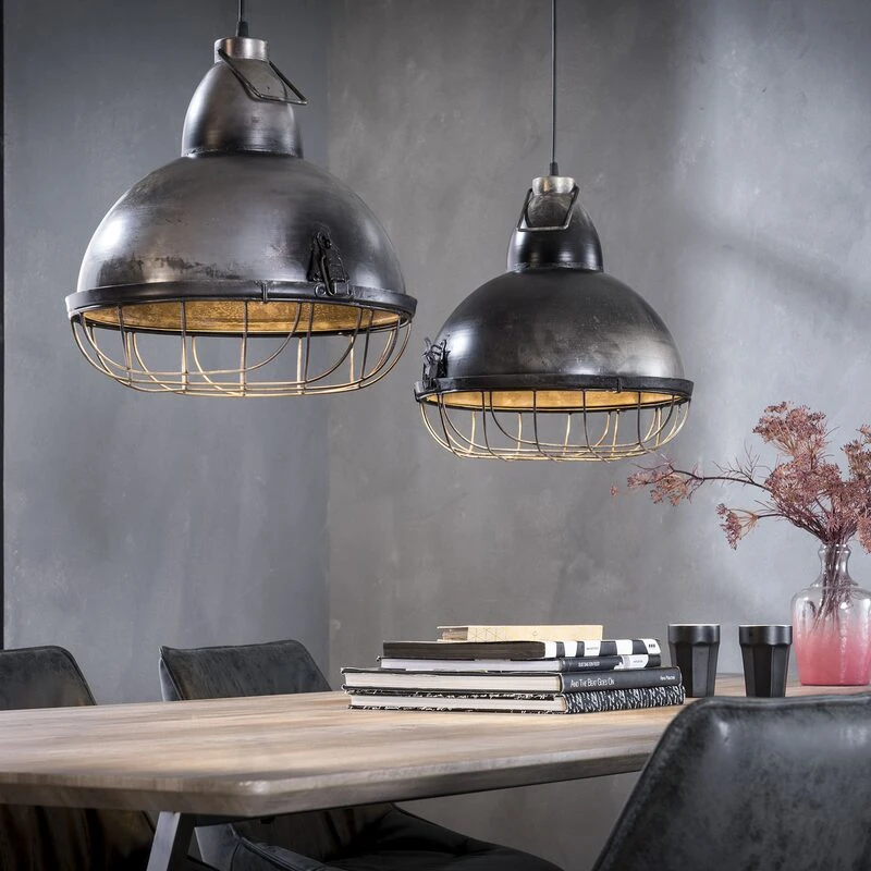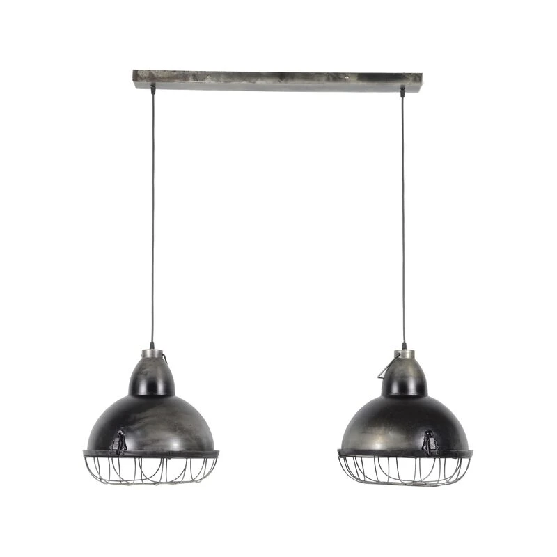 Deux gros projecteurs métalliques dotés d’une grille protégeant l’ampoule descendent de votre plafond. De quoi instaurer une ambiance casual dans votre pièce en deux temps, trois mouvements. La couleur brute grise et légèrement vieillie des abat-jours et de la base du luminaire contribue à lui donner tout son caractère.