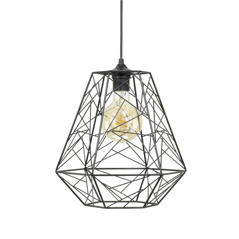 Cette suspension noire se compose d’une multitude de lignes métalliques se rejoignant pour former une sorte de cage très design.