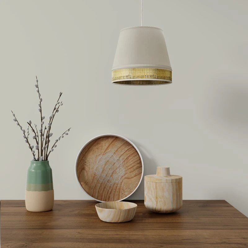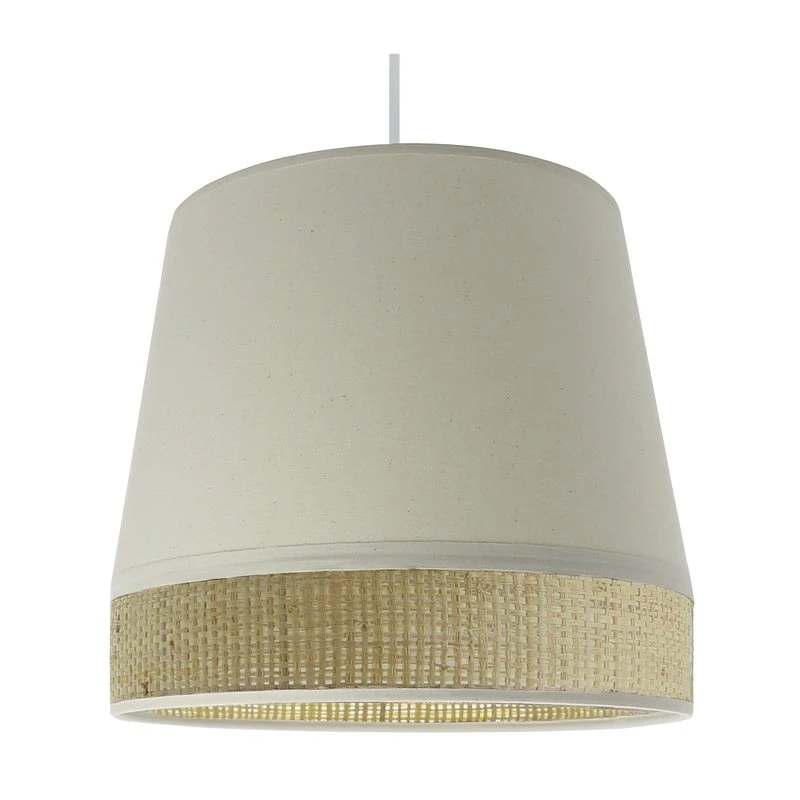 L’abat-jour en matière naturelle sublimé par un tissu beige offre une lumière douce, parfaite pour finaliser une décoration tropicale.