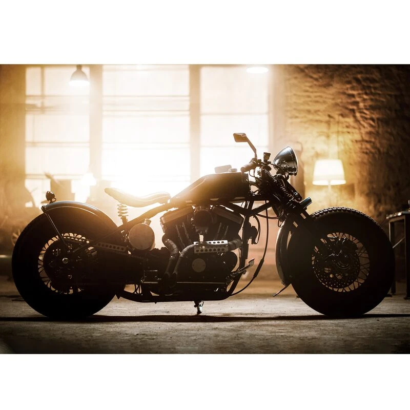 La lumière intense qui provient du fond de la pièce vient mettre en valeur cette sublime moto custom.