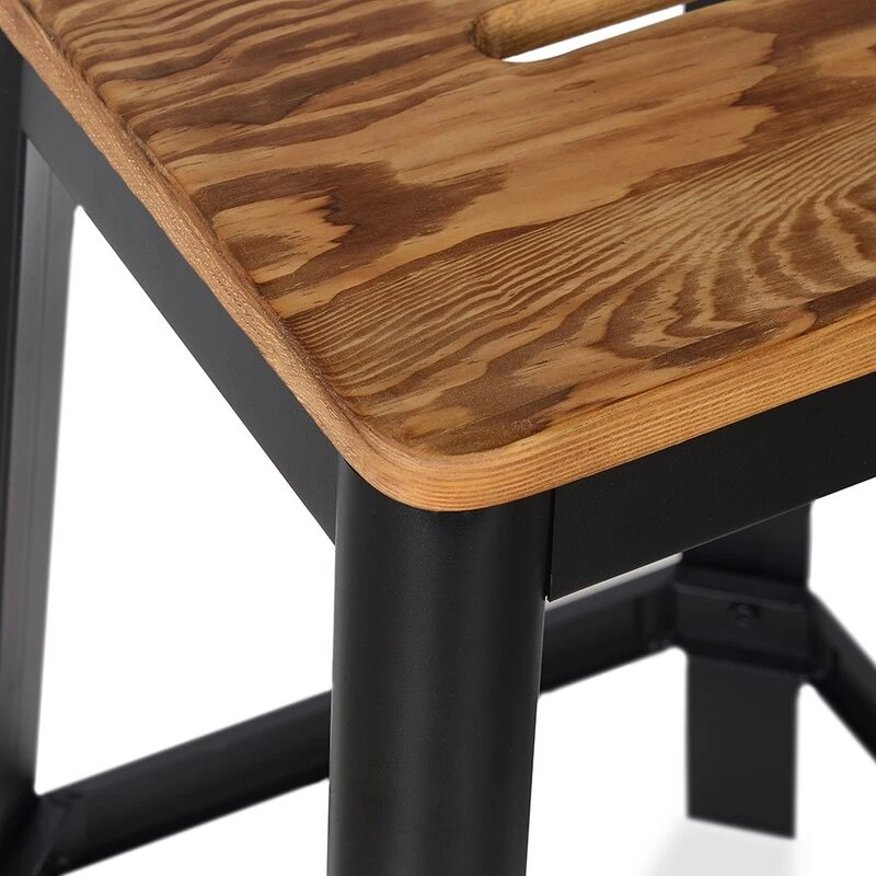 Il est composé d’une structure en fer dont les quatre pieds tubulaires s’évasent vers le sol et sont reliés entre eux par des barreaux qui vous permettront de poser vos pieds. Son assise est, quant à elle, composée de pin, bois connu pour sa résistance et sa robustesse.
