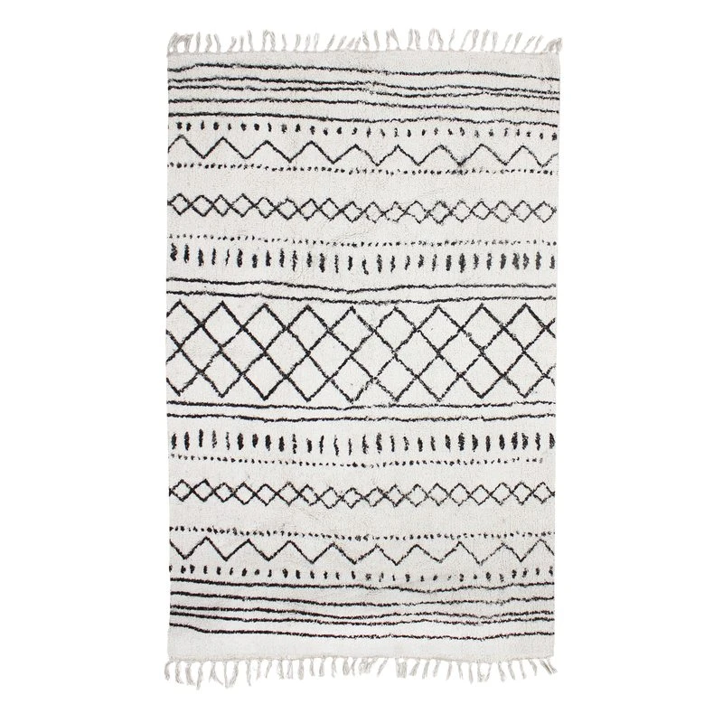 Optez pour le tapis LAÏLA et ses couleurs chics et intemporelles ! Les formes noires géométriques se dispersent sur le tapis blanc écru pour vous apporter une touche à la fois ethnique et élégante. Le tissu épais réchauffe votre déco et offre un espace convivial et accueillant.