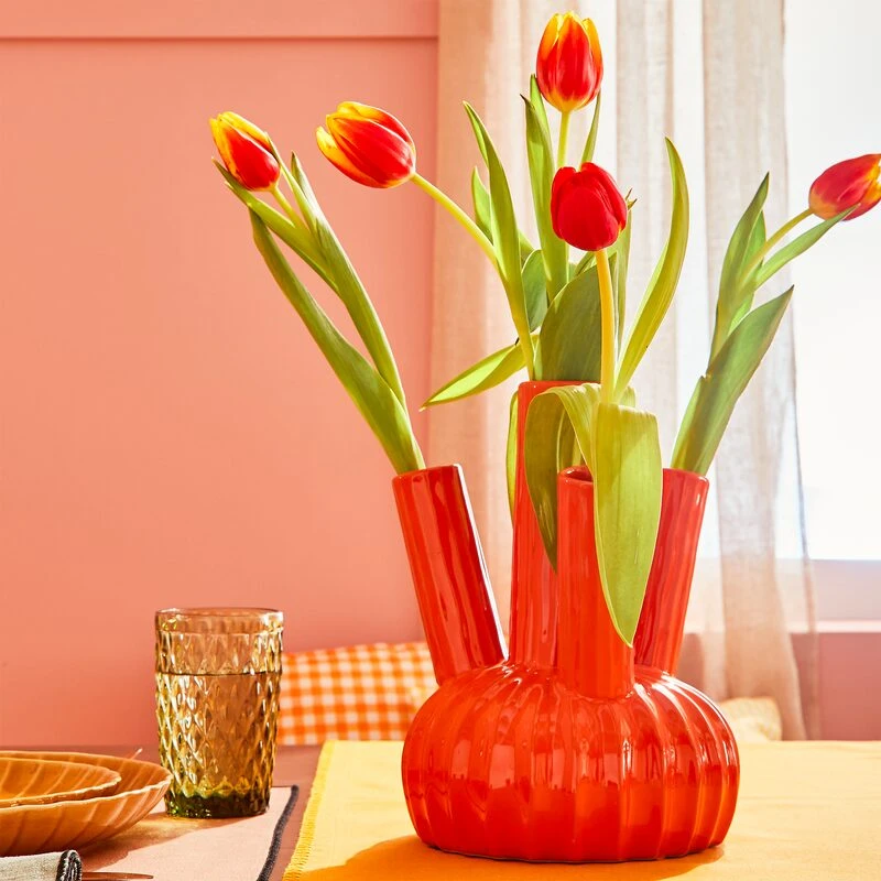 La couleur orange du vase FELIPE s’intègre aussi bien dans une décoration de type cottagecore que dans un intérieur pop, urbain ou design. Installez votre nouvel objet déco préféré sur une enfilade dans la salle à manger, au centre de la table basse du salon ou encore sur une console dans l’entrée. Osez le mélange des genres en optant pour du mobilier en bois foncé dont le petit côté rétro se mariera à la perfection avec la modernité du vase en céramique FELIPE.