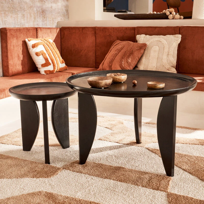Ces deux tables basses sont fabriquées en bois de manguier, un matériau très résistant, qui a été teinté en noir. Les pieds de ces tables arborent un design original qui les différencie des piètements classiques.