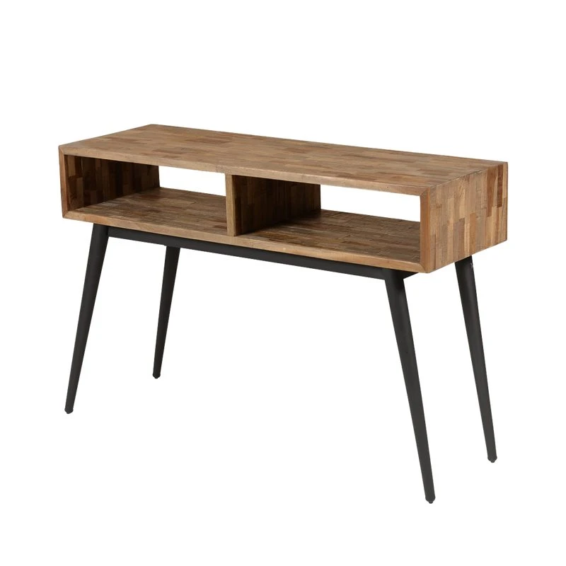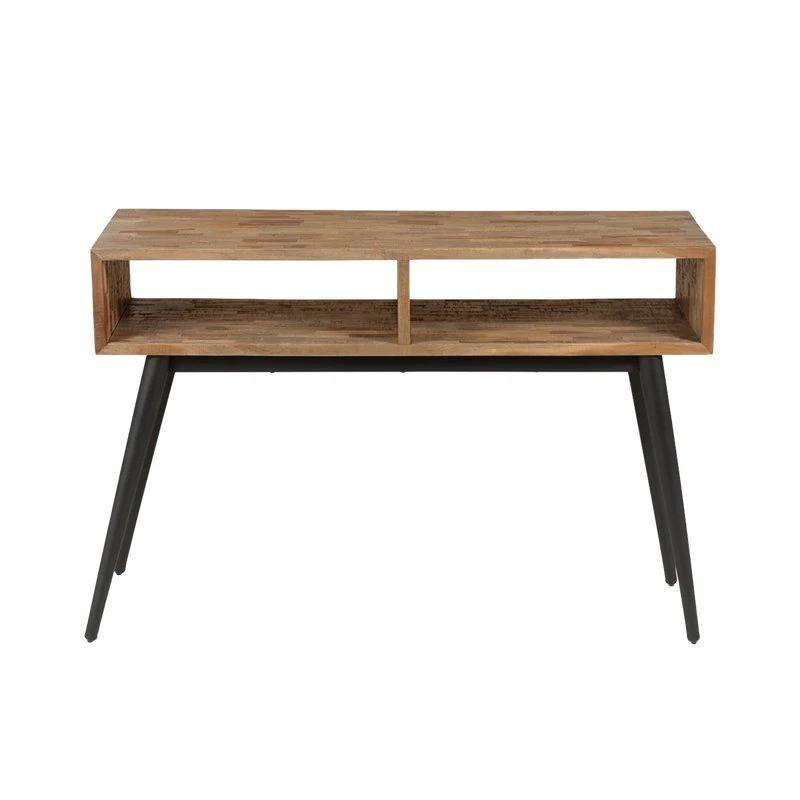 Fabriquée à partir de teck recyclé, elle offre un design sobre, souligné par un piètement métal noir fin et raffiné. Une alliance de matériaux bruts qui est parfait dans un intérieur nature mais aussi d’inspiration industrielle.